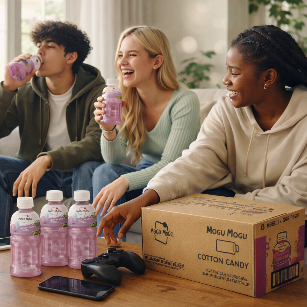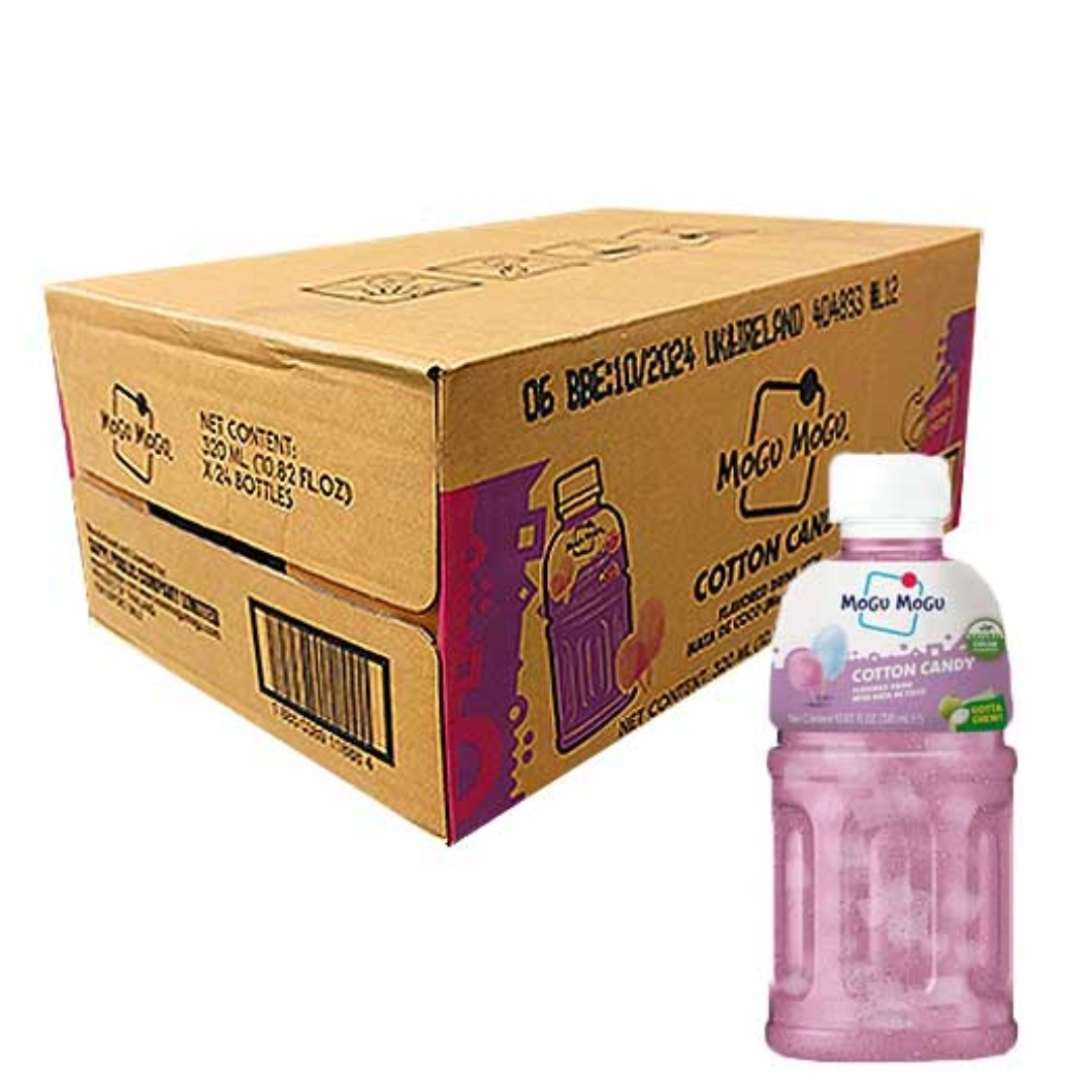 CASE OF 24 BOTTLES — Full case of 24x320ml Mogu Mogu Cotton Candy flavoured drinks with nata de coco, ideal for bulk buying, sharing or resale