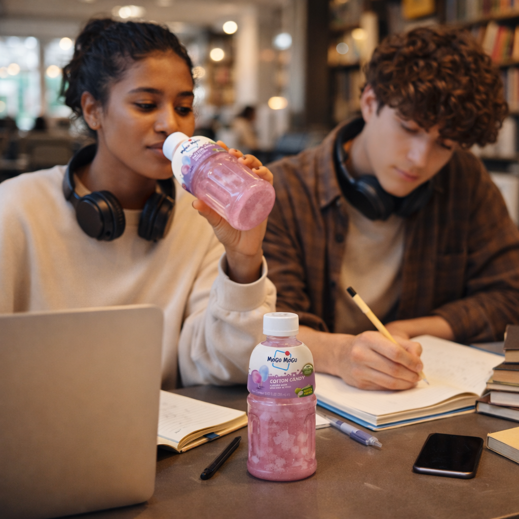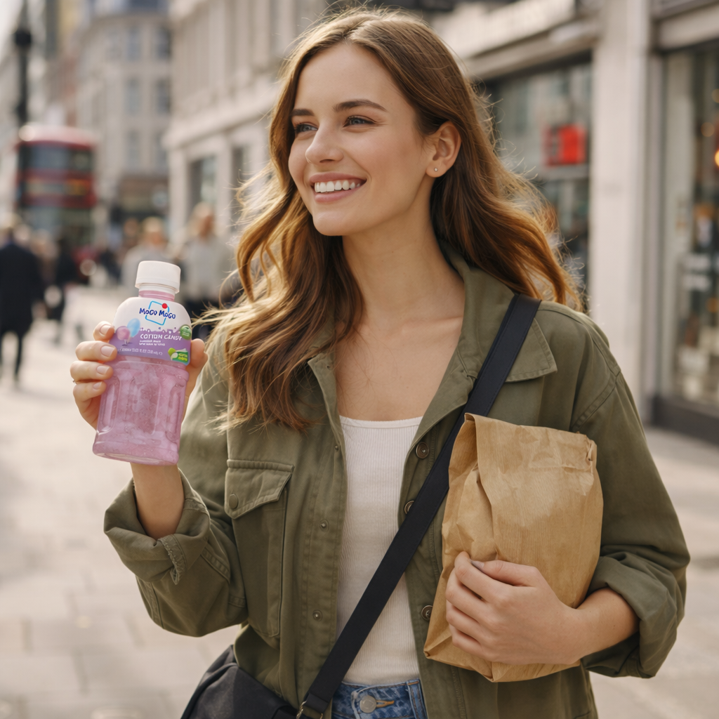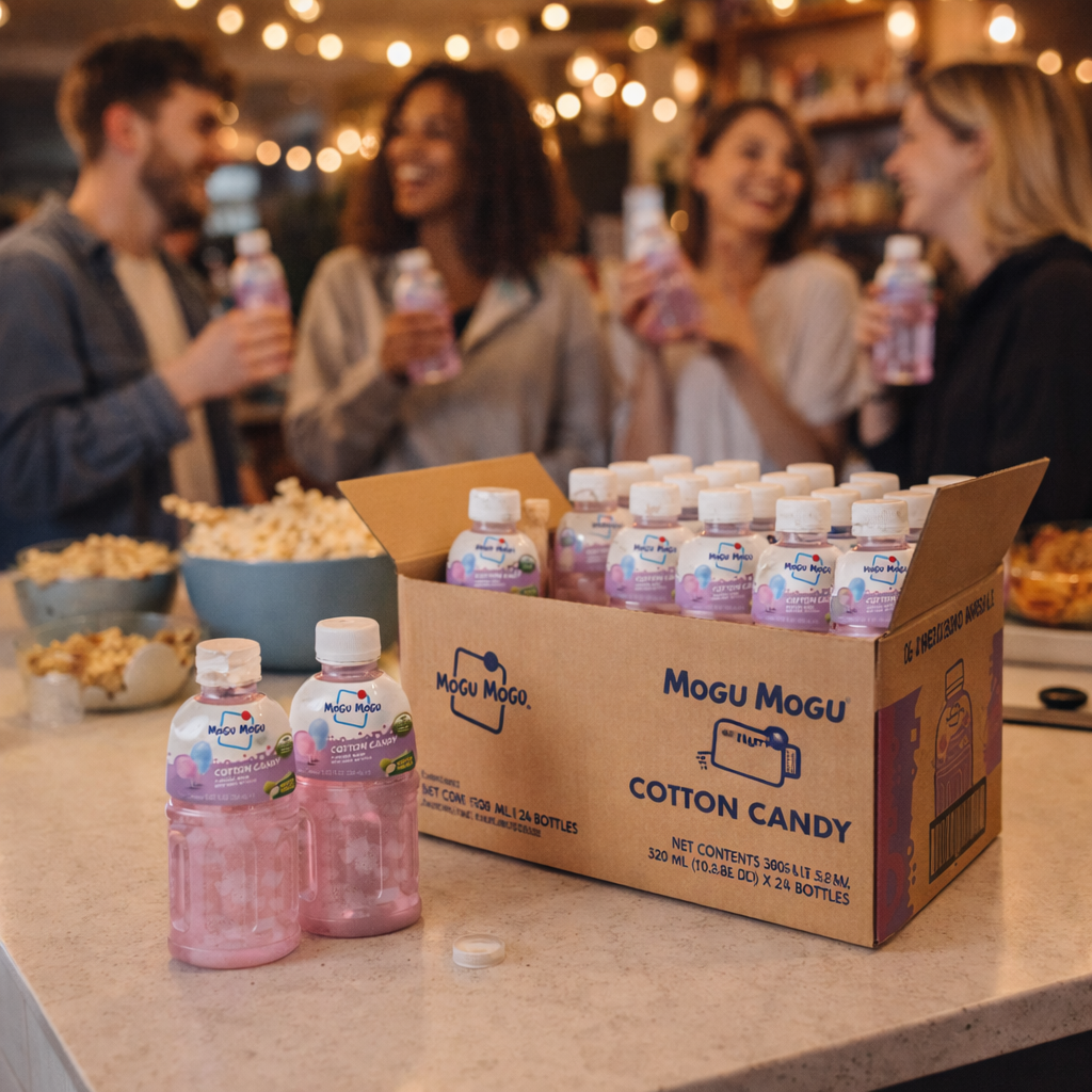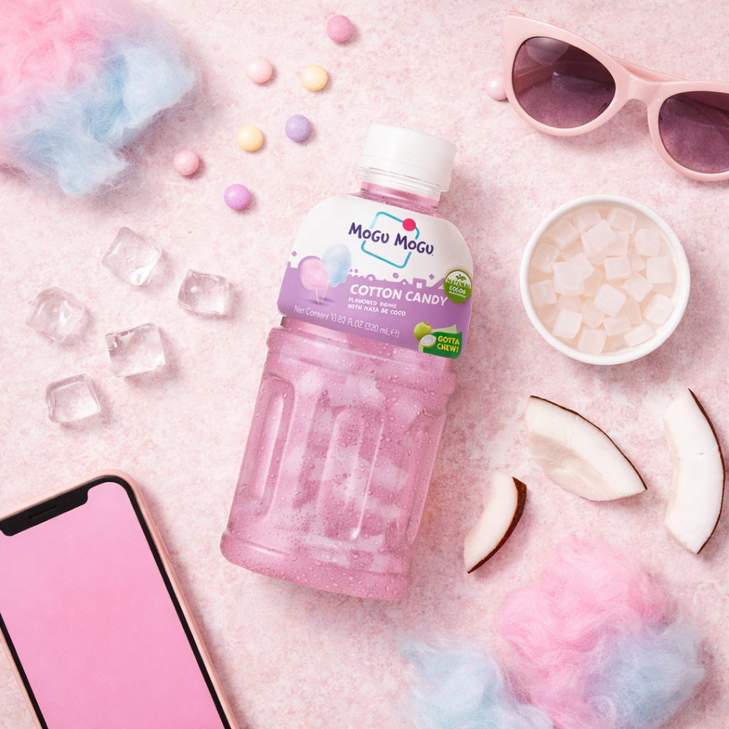 Mogu Mogu Cotton Candy Flavoured Drink with Nata De Coco — 24x320ml case. A fun, refreshing Thai drink bursting with sweet cotton candy flavour and chewy coconut jelly pieces in every sip. Made with 15% real nata de coco and natural colours from carrot, sweet potato and radish concentrate. Perfect chilled as a snack, party drink or lunchbox treat. The iconic “Gotta Chew” bottle loved by kids and adults across the UK. Product of Thailand. Contains coconut. Store in a cool, dry place away from sunlight.