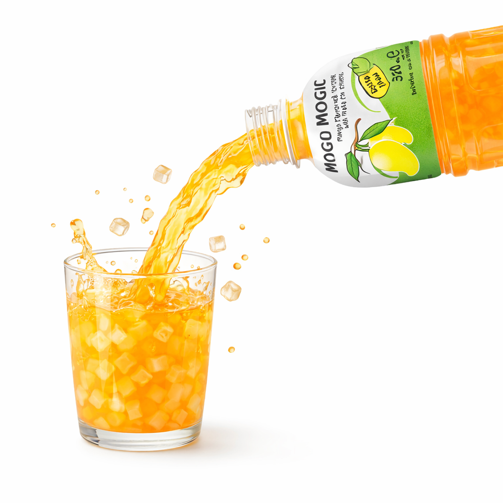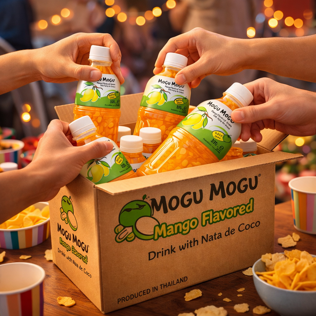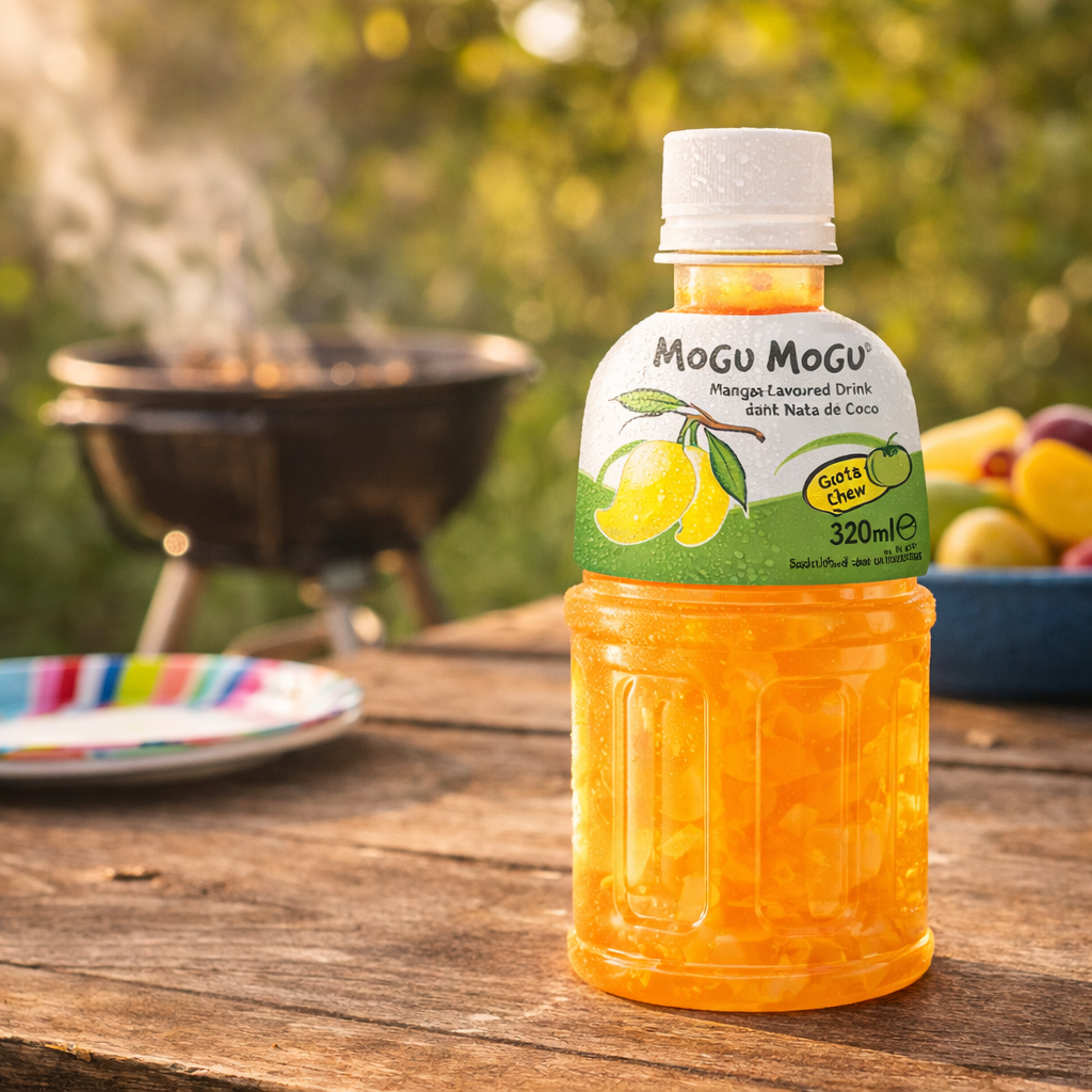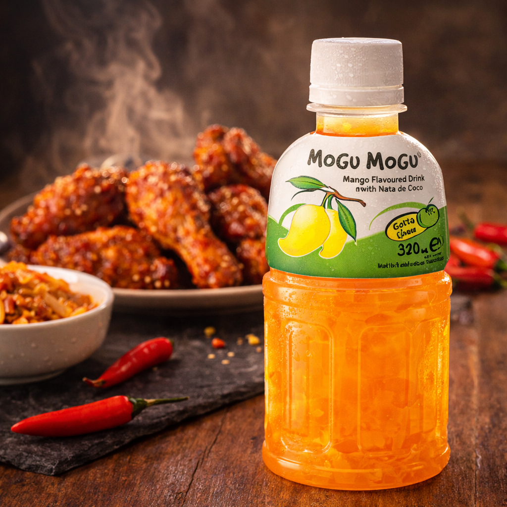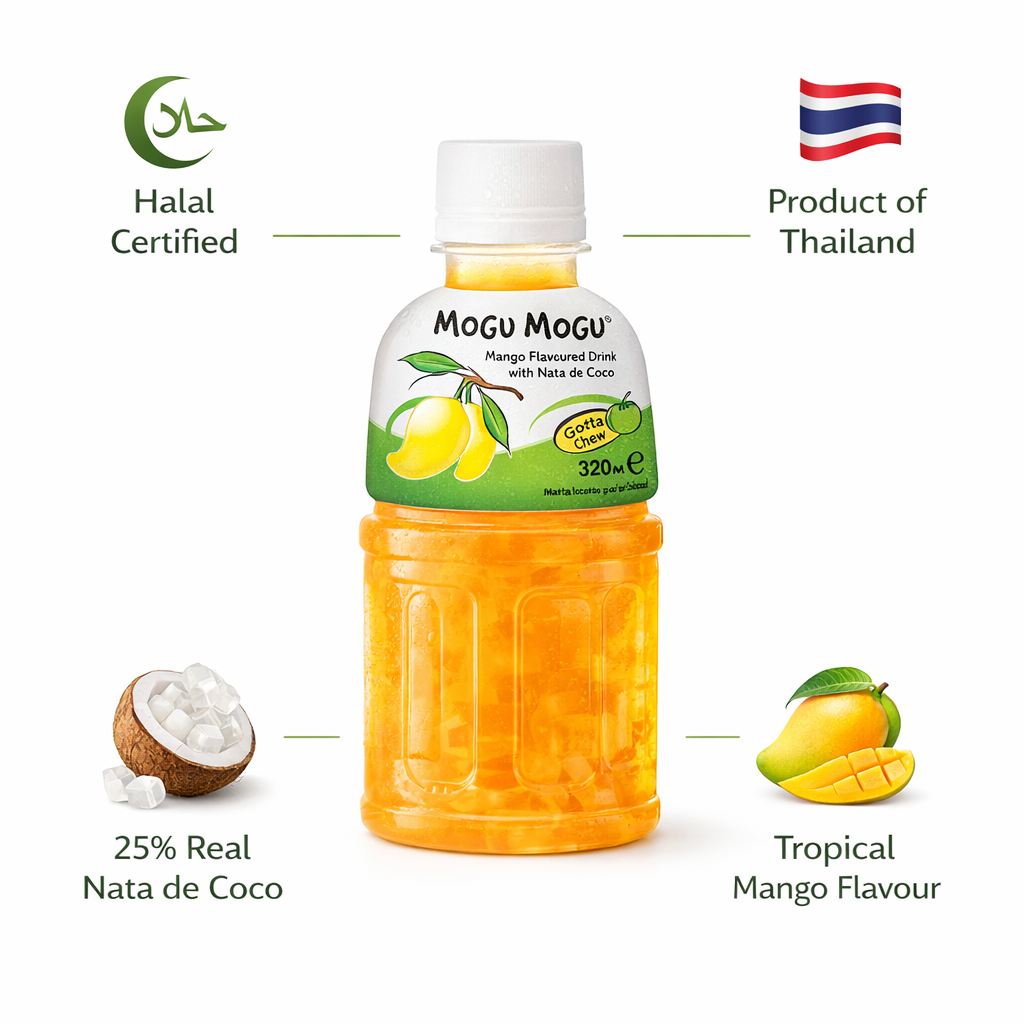 Mogu Mogu Mango Flavoured Drink with Nata de Coco — full case of 24 x 320ml bottles. Made in Thailand and Halal certified. Bursting with tropical mango flavour and loaded with 25% chewy coconut jelly pieces for the iconic “Gotta Chew” experience. The perfect cooling companion for spicy food lovers — pair it with hot wings, jerk chicken, Korean fried chicken or any fiery dish to refresh your palate between bites. Serve chilled for maximum enjoyment. Ideal for sharing, parties and everyday hydration.