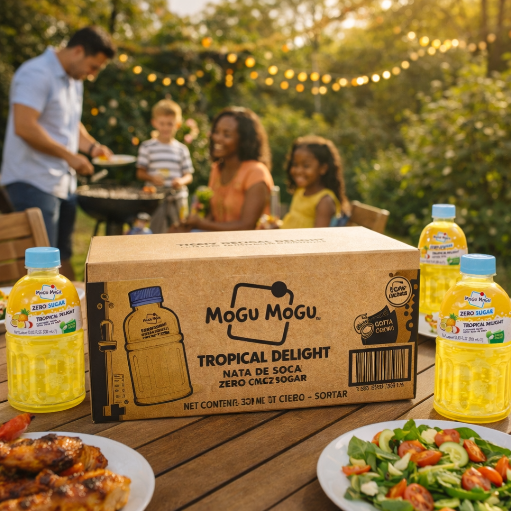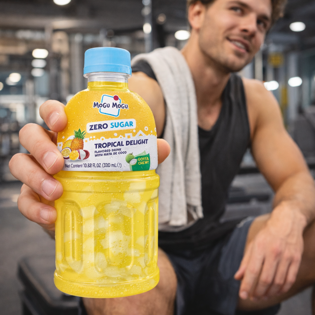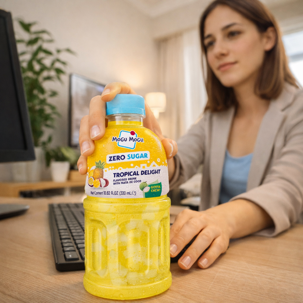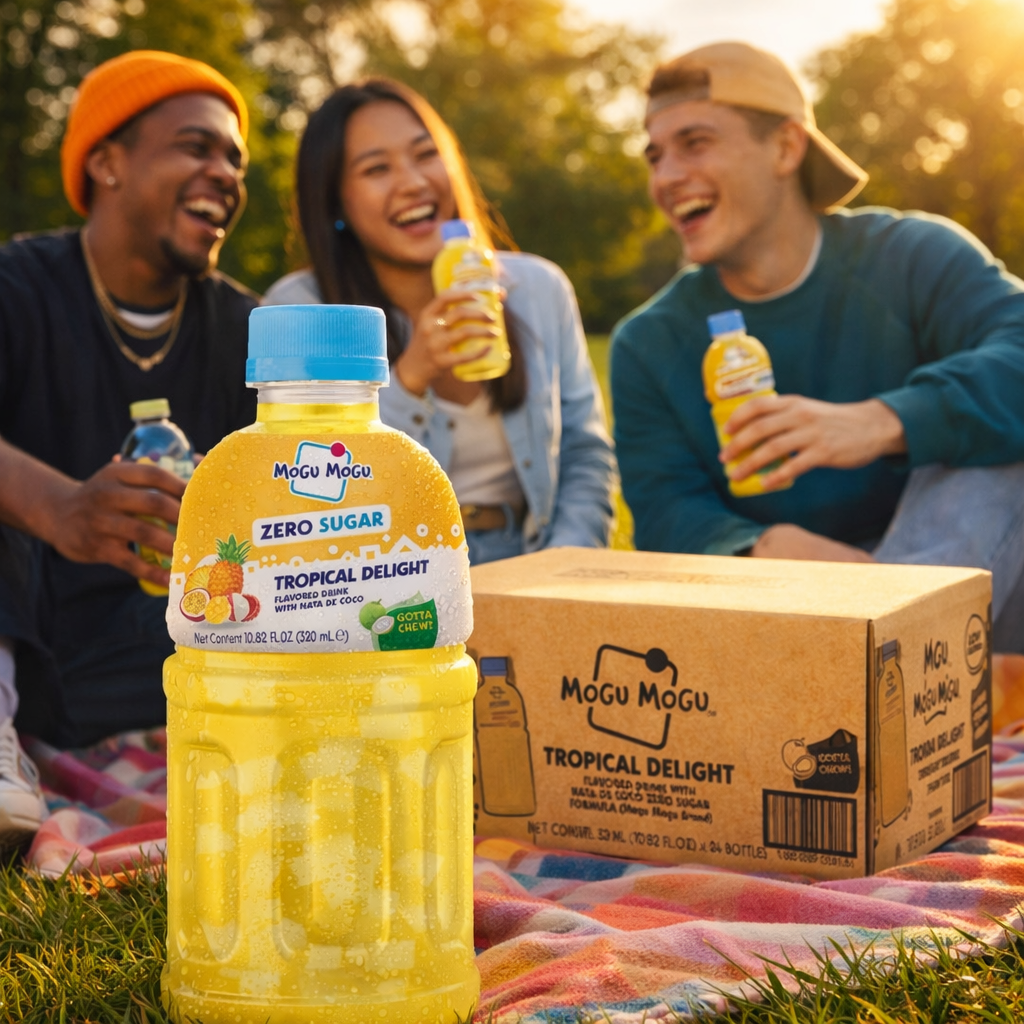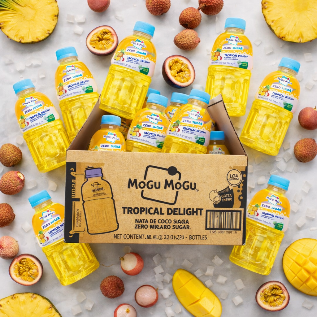 Mogu Mogu Tropical Delight Zero Sugar 24x320ml – A refreshing tropical fruit drink with chewy nata de coco pieces in every bottle. Blended with real mango, pineapple, passion fruit and lychee juice for an exotic taste sensation. Only 3 kcal per 100ml with zero sugar – all the flavour, none of the guilt. 15% coconut jelly pieces make this a fun chew-and-drink experience loved by kids and adults alike. Bulk box of 24 bottles, perfect for families, parties, offices and wholesale. Best served cold.