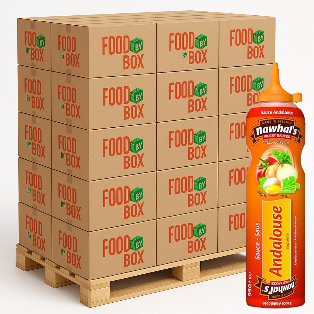Premium Nawhal’s Andalouse Sauce wholesale pallet – 50 boxes containing 600 bottles of authentic Belgian sauce (950ml each). Perfect for restaurants, catering businesses, food service, and retailers. European pallet with 5 layers of 10 boxes. Made in Belgium using finest ingredients. Classic rouge formula ideal for fries, burgers, sandwiches. Bulk purchase savings with free UK mainland delivery in 3-5 working days. Total 570 litres of premium Andalouse sauce.