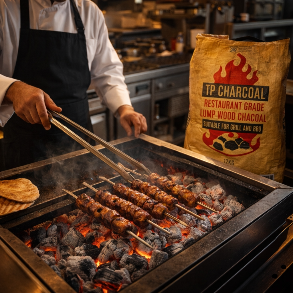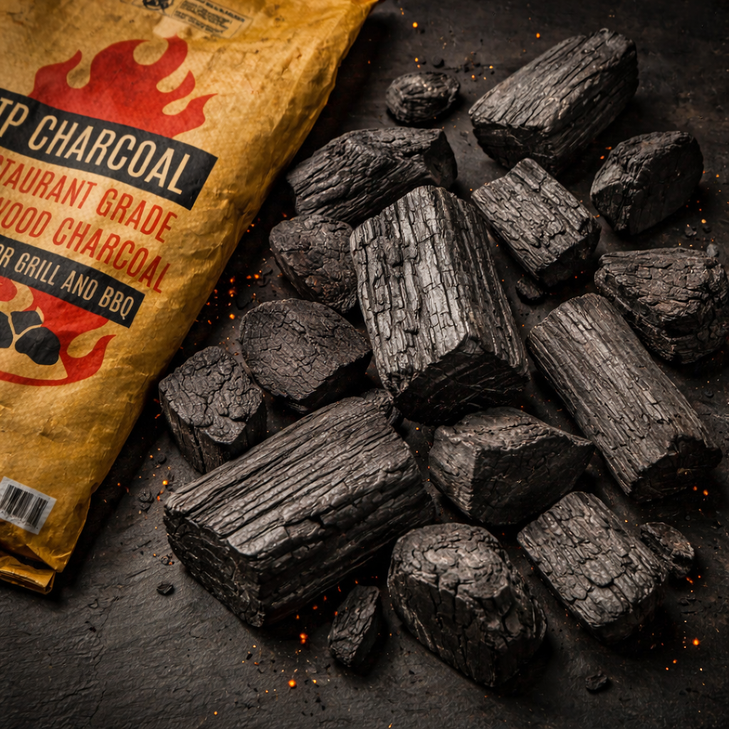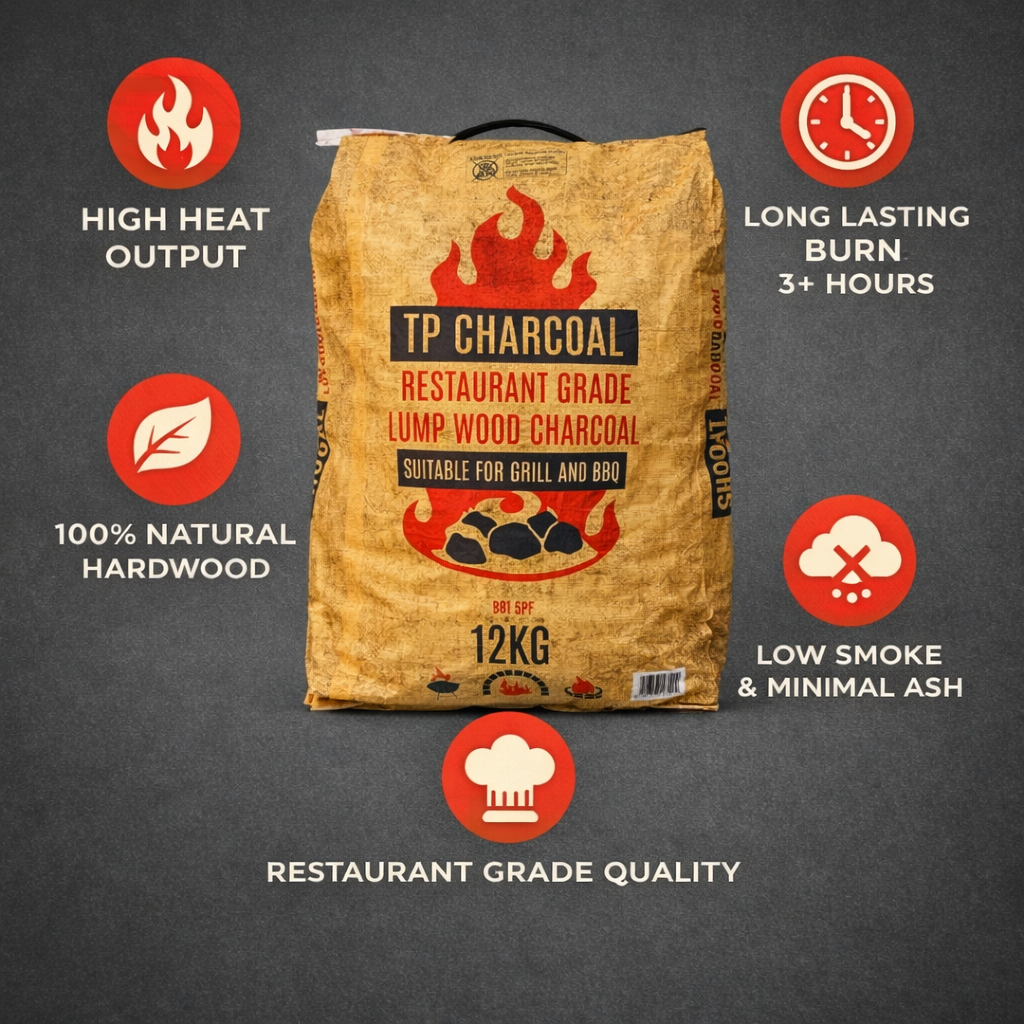 TP Charcoal Restaurant Grade Lumpwood Charcoal 12kg — 100% natural hardwood charcoal sourced from dense Namibian wood. Burns hotter and longer with minimal ash and low smoke, delivering consistent high heat for authentic smoky flavour. Large uniform lumps light quickly and hold temperature for hours. Ideal for BBQs, grills, smokers, kamados, tandoori ovens, Turkish grills, pizza ovens, and fire pits. Perfect for restaurants, professional chefs, catering, family gatherings, and garden barbecues.